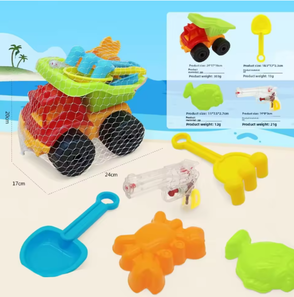 بالرمل صار احلى. هذا طقم كامل يجي فيه 8 قطع. فيه قلاب رهيب عشان ولدك يحمل الرمل وينقله، ومعه اغراض ثانية زي المجرفة والقوالب عشان يبني قلاع ويسوي اشكال. لعبة بطلة للبحر او الحوش او حتى مع الرمل السحري. مصنوعة من بلاستيك قوي وامن على العيال.