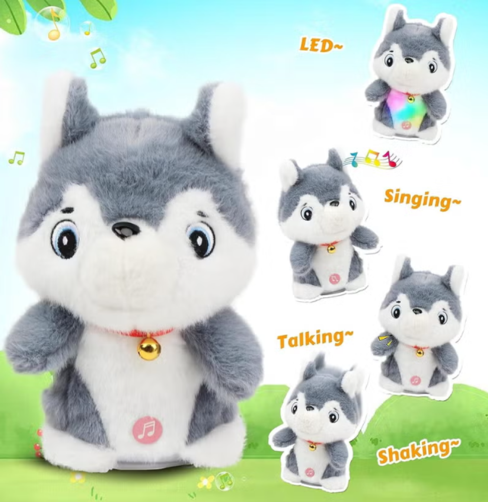 لعبة هاسكي كهربائية قطيفة للأطفال، تهتز وتغني مع إضاءة ملونة على البطن، وتقلد صوت الطفل بطريقة مضحكة وتفاعلية. تصميم لطيف وحجم مناسب للحمل، تساعد على تنمية الخيال ومهارات التواصل، ومثالية كهدية ممتعة للأطفال.