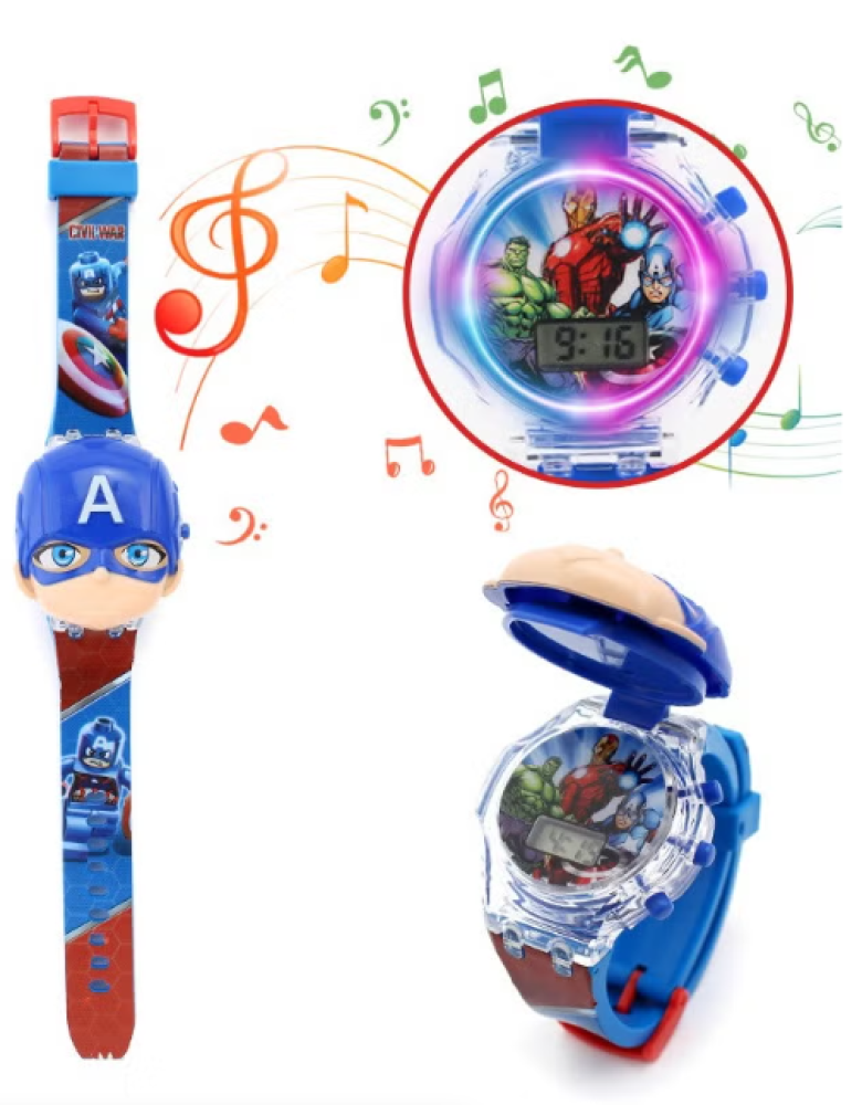 ساعة الكترونية بشكل كرتوني يحبونها العيال. فيها انوار رهيبة وموسيقى تونسهم. تعتبر لعبة وساعة في نفس الوقت ومقاومة للموية عشان اللعب والحركة. مصنوعة من مواد آمنة وعالية الجودة.