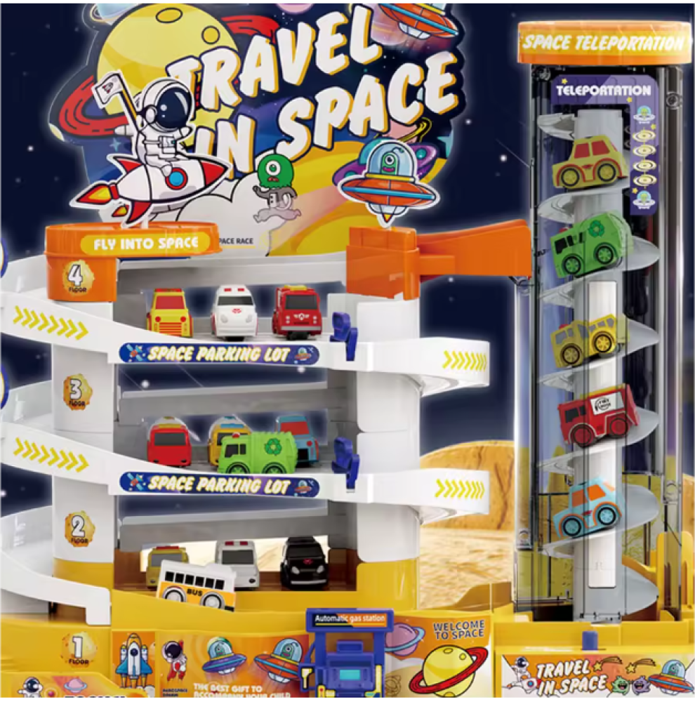 لعبة مسار سيارات للأطفال بتصميم مغامرة الفضاء مع موقف سيارات من 4 طوابق.